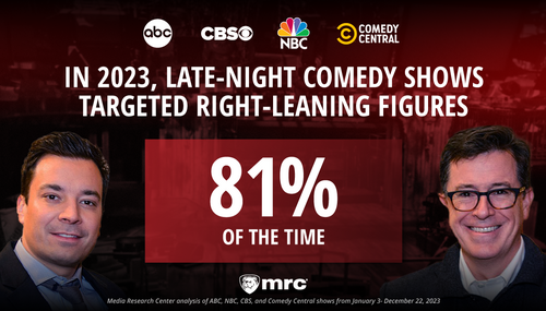 Throughout all of 2023, the late night comedians told a total of 9,518 political jokes, and of these 7,729 or 81 percent were directed at someone or something on the right side of the political spectrum, an MRC study has found.
