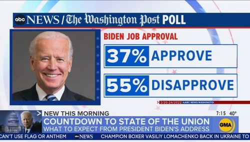 The mission statement of ABC News, and other media outlets, appears to be this: It’s our job to protect you from reality. The Biden administration is crumbling under the weight of record high gas prices and inflation and now what’s seen as an ineffectual response to the Russian invasion of Ukraine. Here’s the last five polls of Biden’s approval rating: 38, 39, 40, 38, 37.