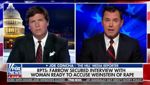 Leading off Thursday’s Tucker Carlson Tonight, the eponymous FNC host and The Hill’s Joe Concha provided a proverbial beatdown to NBC News for “lying” in their cover-up and reluctance to cover the Harvey Weinstein allegations of sexual misconduct. The focus has largely (and appropriately) remained on the victims, but Carlson noted that it’s worth discussing how NBC News joined with “[m]any…