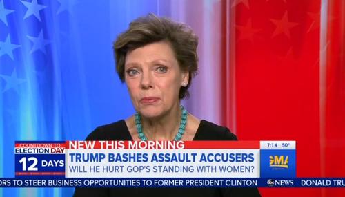 Thursday morning on ABC’s Good Morning America, anchor George Stephanopoulos and commentator Cokie Roberts repeatedly cast doubt on the idea that Donald Trump’s sexual assault accusations could be false. After being grilled by Stephanopoulos, Trump dismissed the accusations as made up stories but that wasn’t adequate for ABC’s Cokie Roberts who reacted skeptically.