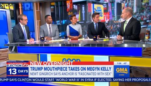 Wednesday, ABC had a field day talking about the fiery exchange between Newt Gingrich and Megyn Kelly on FNC’s The Kelly File Tuesday night. Anchors David Muir and Robin Roberts joined analysts Matthew Dowd and Jon Karl to trash Gingrich for badgering Kelly about the Clintons’ scandals. Muir asked what the Trump team “has to gain by taking on Megyn Kelly,” before the panel argued this would only…