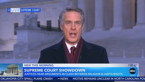 On Monday and Tuesday, ABC’s Good Morning America and World News Tonight covered the Supreme Court case involving a Christian businesswoman being taken to court to force her to create a website for a gay wedding with heavy doses of fear-mongering and scorn. Over three segments, senior national correspondent Terry Moran insisted support for religious liberty would turn back…