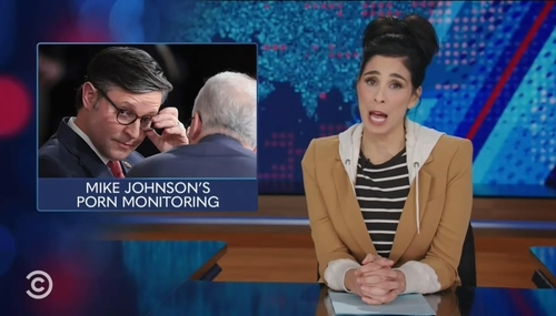 Sarah Silverman returned to Comedy Central for round two of temp hosting The Daily Show on Monday and spent the majority of the program attacking Speaker Mike Johnson, including for putting porn accountability software on his and his son’s phones. Meanwhile, ABC’s Jimmy Kimmel did the same, labeling it “strange.”
