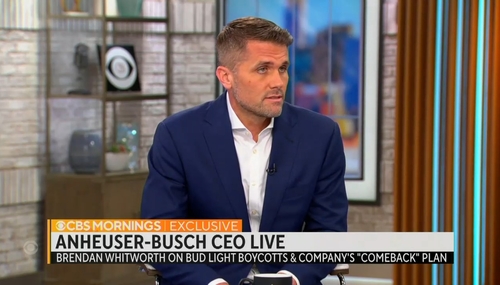 Anheuser-Busch CEO Brendan Whitworth joined the crew of CBS Mornings on Wednesday to discuss the fallout to Dylan Mulvaney marketing campaign. It would prove to be a segment full of corporatespeak, Republican bashing, and covering up of just how badly the campaign backfired.