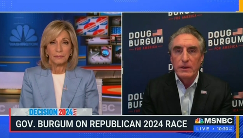 North Dakota Gov. and GOP presidential candidate Doug Burgum took his campaign to MSNBC’s Andrea Mitchell Reports on Thursday where he ever so politely informed the eponymous host that he isn’t an extremist on abortion and that her framing of “LGBTQ issues” is all wrong, including how she portrayed the Supreme Court standing up for religious liberty.