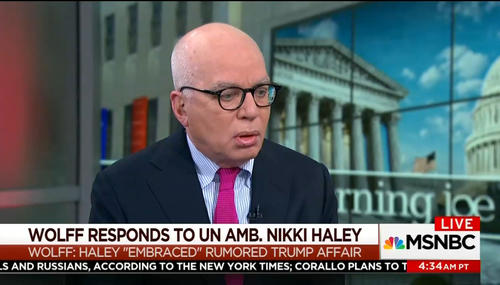 On Thursday, the panel on MSNBC’s Morning Joe dog piled Michael Wolff for propagating an unfounded rumor that President Trump had been having an affair with his ambassador to the U.N., Nikki Haley. The confrontation became so heated that the show’s co-anchor Mika Brzezinski eventually cut the interview short and asked Wolff to leave