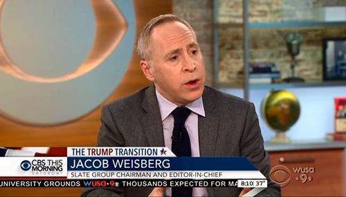 Critics from across the media spectrum have slammed BuzzFeed for publishing something they failed to corroborate, a 35-page dossier of smarmy allegations against Donald Trump that was assembled by a firm hired to do opposition research on the GOP candidate. But on CBS Saturday morning, Slate editor-in-chief Jacob Weisberg saluted BuzzFeed’s decision to disseminate the anti-Trump hit piece: “I’m…