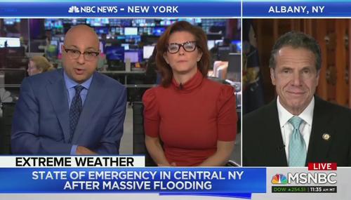 This afternoon on MSNBC, hosts and climate change propagandists Ali Velshi and Stephanie Ruhle sat back and stayed silent as their Democrat guest made an absurdly comical declaration about climate change. While discussing the flooding in New York, Gov. Andrew Cuomo told the hosts the natural disaster was not only due to climate change, but they never had these natural disasters before.