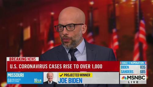During MSNBC’s live post-Super Tuesday II coverage early Wednesday morning, podcast host and stand up comic Pete Dominick went on a nasty rant against President Trump over the coronavirus. While many in the media have feigned outrage at the notion they are politicizing this pandemic, Dominick admitted proudly that they are, because Trump "doesn't care about us" or "science."