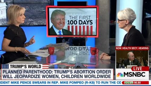 On her 12 p.m. ET hour MSNBC show on Tuesday, anchor Andrea Mitchell teed up former Undersecretary of State Wendy Sherman to denounce President Trump for reinstating the Mexico City policy banning U.S. foreign aide from funding abortions. In addition, Mitchell agreed with a stunning accusation hurled by the Obama administration official.