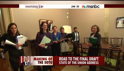 Tuning into the middle of a Morning Joe segment today, at first I assumed that MSNBC's Ari Melber was chatting with the Oscar nominees. But no, turns out Melber had scored interviews with President Obama's SOTU speechwriting team. You'll excuse my confusion. As you'll see, just like the Oscar hopefuls, the SOTU writers appear to be a panorama of people of pallor.