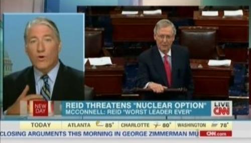 While NBC and CBS covered Senate Majority Leader Harry Reid and Senate Minority Leader Mitch McConnell having a "war of words" over GOP opposition to some of President Obama's nominees, neither network detailed the hypocrisy of Reid considering the so-called "nuclear option" to eliminate the filibustering of such nominees.