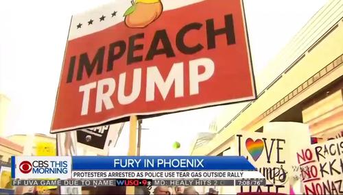 Seeming to place the responsibility on Donald Trump, CBS This Morning on Wednesday pointedly noted that protesters in Phoenix didn’t become violent until after the President spoke. Reporting from the scene, journalist Carter Evans observed, “This is where thousands of protesters and Trump supporters were gathered before the rally. They were very vocal, but largely peaceful.”