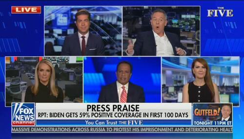 Early Wednesday night, the Fox News Channel’s The Five dedicated a full segment to the latest hit study from the MRC’s Research Director Rich Noyes, which showed a massive statistical disparity in heavily positive network evening news coverage of President Biden’s early days in the White House versus incredibly negative coverage of then-President Trump in 2017.