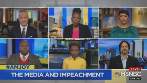 Joy Reid and her panelists complain that the media is being unfair to Democrats, seeing impeachment through Republican eyes. The media "worships Republican hardball"? It's "dangerous" and "racist" to interview Trump supporters?