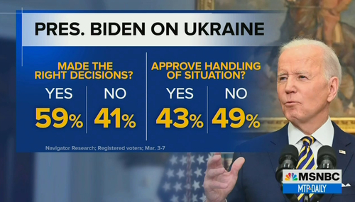 On Monday’s MTP Daily, fill-in co-host Garrett Haake and a panel of liberal pundits lamented that President Biden was not seeing a “Zelenskyy bounce” in the polls for his handling of the war Ukraine. For some reason they thought the overwhelming popularity of the heroic Ukrainian leader, President Volodymyr Zelenskyy, should transfer to Biden.