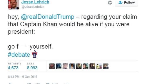 Aside from the fireworks inside the debate hall at Sunday’s second presidential debate, one campaign controversy that bubbled up that CBS and NBC refused to acknowledge in their post-debate analysis was a tweet from a Hillary Clinton campaign aide telling Donald Trump to “go fuck [himself]” regarding his treatment of the Khan family.