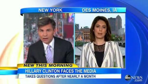 Journalists on all three networks, Wednesday, covered Hillary Clinton talking to reporters for the first time in a month. Yet, ABC's Good Morning America managed to do the story without any Republican critics and with George Stephanopoulos returning to anchor the segment. GMA correspondent Cecilia Vega underlined, "Twenty eight days. That's how long Hillary Clinton went without taking questions…