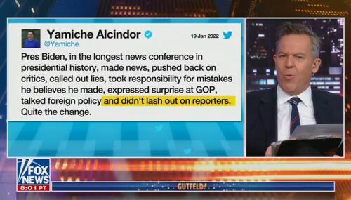 On Thursday night, Fox News late-night host Greg Gutfeld began with mostly negative reactions to Biden's press conferfence on CNN and MSNBC, and then drew a contrast with NBC reporter Yamiche Alcindor for her "kiss-ass tweet" praising Biden as so much better than Trump. Alcindor bizarrely claimed Biden didn't "lash out" at reporters, with Gutfeld demonstrated was false.