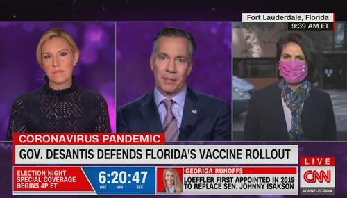 CNN's Jim Sciutto and Poppy Harlow took a break from their Tuesday morning Georgia special election coverage to talk with Rosa Flores about her Monday battle with Florida Gov. Ron DeSantis over vaccine distribution and who is to blame for senior citizens not getting vaccinated. According to Sciutto, DeSantis' performance, was embarrassing as man.