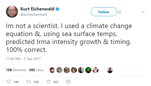 Meteorologists and climatologists on Twitter criticized Newsweek Senior Writer Kurt Eichenwald after he claimed a “climate change equation” helped him make a prediction about Hurricane Irma. Eichenwald is also an MSNBC and Vanity Fair contributor and a New York Times best-selling author.