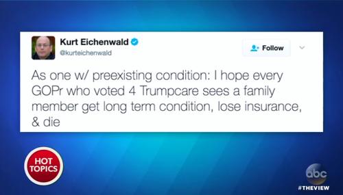 Newsweek writer Kurt Eichenwald has no problem using his platform as a member of the media to hurl death threats against those whom he disagrees with. After House Republicans passed the AHCA last Thursday, the liberal writer took to Twitter to air his grievances against the bill by wishing that their family members would be tortured and die. (Yes, really.)