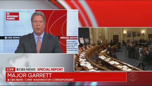 CBS Chief Washington Correspondent Major Garrett on Tuesday offered what amounted to an extended commentary about the Republican response during the impeachment hearing, attacking them as “repetitive” and for a “hatchet attack” on the media. In his opening statement, Republican Congressman Devin Nunes derided, “If you watched the impeachment hearings last week you may have noticed a disconnect…
