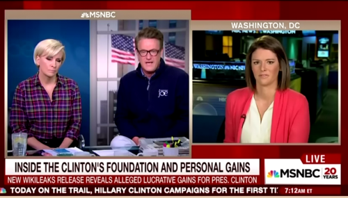While WikiLeaks revelations concerning corruption at the Clinton Foundation where released today, on Thursday’s Morning Joe, MSNBC’s political correspondent Kasie Hunt obnoxiously stated that “Hillary Clinton is enjoying an enormous honeymoon period. Whether it’s with the press who covers her or whether it’s with the polling. She's really riding high.”