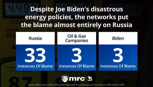 Americans over the last month have been enduring painful, skyrocketing gas prices. The impacts are echoing out to all parts of the economy and squeezing already stressed wallets. But if you watched the morning and evening network newscasts, you would think almost all the blame for this falls on Russia’s invasion of Ukraine. Joe Biden? His role has almost entirely been ignored. From February 24…