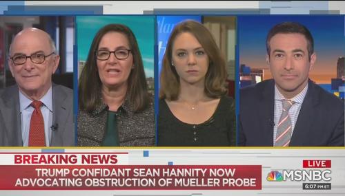 The panel on Thursday’s edition of MSNBC’s The Daily Beat with Ari Melber spent more than ten minutes overreacting to comments made by Fox News's Sean Hannity on his show Hannity Wednesday night. Hannity jokingly advised witnesses in the Mueller probe, who have been asked to turn in their phones to Special Counsel Robert Mueller: “Use bleach bit, remove the SIM cards and then take the pieces…