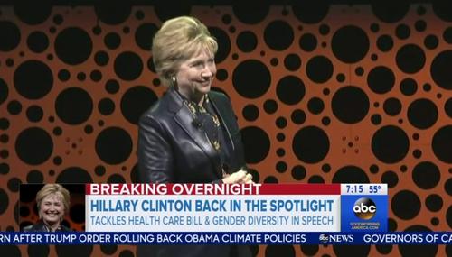 She may have lost the election but that doesn’t mean the media doesn’t still hang on her every word. After Hillary Clinton made a surprise appearance before an audience in San Francisco attending a diversity conference March 28, the networks couldn’t get enough. ABC, NBC and CBS all devoted time to Clinton’s speech the next morning, playing several clips where she bashed the White House for its…