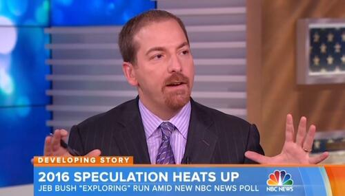 Appearing on Wednesday's NBC Today, Meet the Press moderator Chuck Todd spun former Florida Governor Jeb Bush announcing that he was "exploring" the possibility of running for president in 2016 as a boost for the candidacy of Hillary Clinton: "By the way, the big Jeb Bush announcement helps Hillary because it'll scare Democrats and rally them around Hillary even more."