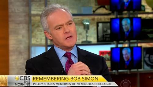 As CBS mourned the loss of veteran 60 Minutes correspondent Bob Simon after he was killed in a car accident on Wednesday, Thursday's CBS This Morning invited CBS Evening News anchor Scott Pelley to share his thoughts on the late journalist. While eulogizing his longtime friend and colleague, Pelley took an odd turn when he praised Simon's advocacy, not objectivity: "Bob had a sharp intolerance…