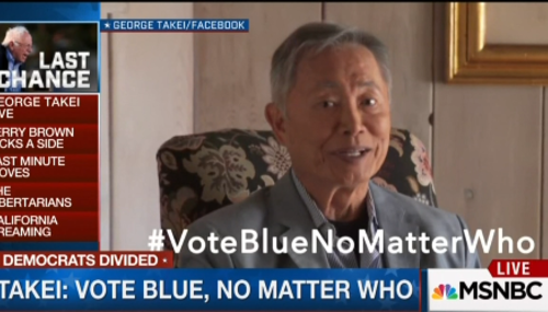 Tuesday morning on MSNBC Live, host Steve Kornacki had liberal actor turned activist George Takei on as a guest. Gone are the days where Star Trek fans remember George Takei as their beloved Mr. Sulu. Now, he has coined the phrase #VoteBlueNoMatterWho, and is encouraging Democrats around the country, specifically Californians, to keep their eye on the prize and get behind Hillary Clinton.