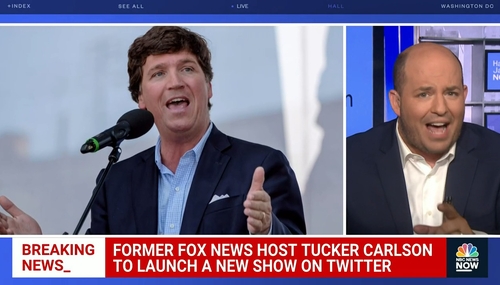 Shortly after former Fox News host Tucker Carlson announced on Twitter that he would be bringing his popular show to the social media platform, Tom Costello while guest hosting NBC News NOW’s Hallie Jackson NOW, brought on failed former CNN host and media janitor Brian Stelter to assist in smearing Carlson, Twitter and the platform’s CEO Elon Musk.