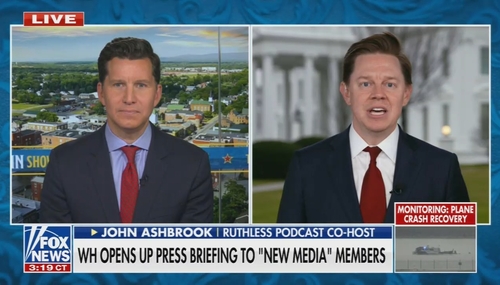 Fresh off having been the recipient Friday afternoon of the White House press briefing’s seats for new media, Ruthless Podcast co-host John Ashbrook dished to new 4:00 p.m. Eastern Fox News Channel host Will Cain what it was like to share a room with many of the reporters he had engaged with for years on Capitol Hill, drawing “a lot of my eye rolls and a lot of smirks.”