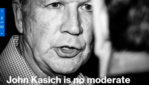 "John Kasich Is No Moderate" a teaser headline at MSNBC.com's home page warns over an ominous black-and-white photo of the Ohio governor. Sure "[t]he genial Ohio governor has forged a reputation as a pragmatic centrist who can bring people together," the teaser caption notes, but, "His record and policy positions tell a different story."