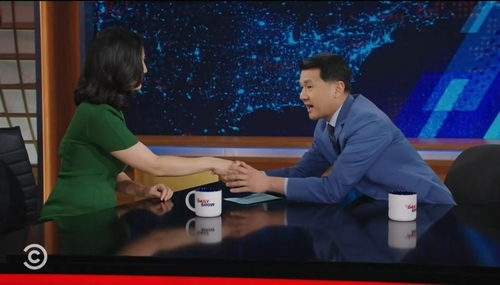 Comedy Central’s Ronny Chieng welcomed Boston Mayor Michelle Wu to the Tuesday taping of The Daily Show for a short two-question interview. Chieng’s first question was simply to ask how Wu became mayor, while the second put the ball on the tee for her to deliver her ode to sanctuary cities. Afterwards, Chieng would heap praise on his guest, telling her she is “the best.”