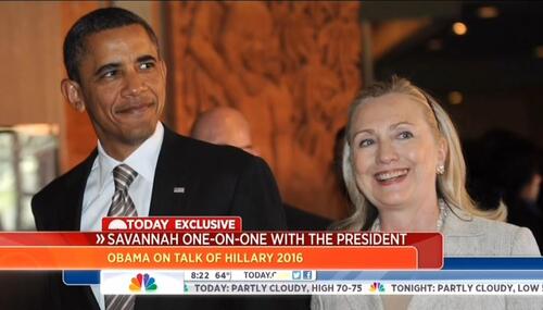 In part two of her interview with President Obama aired on Wednesday's NBC Today, co-host Savannah Guthrie lobbed several softballs, wrapping up the exchange by wondering: "I know you're not endorsing, but do you personally hope that Hillary Clinton runs in 2016?...Do you miss her around here?" [Listen to the audio or watch the video after the jump]