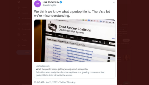 In a now-deleted Twitter thread (but partially preserved by NewsBusters managing editor Curtis Houck) posted Tuesday, USA Today’s Life section drew outrage over a piece originally titled “What the public keeps getting wrong about pedophilia.” The just response from a disgusted public caused them to pull the thread, remove the paywall they initially hid it behind, and stealth edit the…