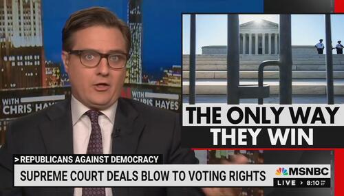 The only thing missing from the set of MSNBC’s All In with Chris Hayes Thursday night was a giant whiteboard with lines connecting unrelated things. That was the manic energy Hayes gave off as he went on an unhinged rant proclaiming that the Supreme Court’s ruling upholding Arizona’s election integrity laws were part of a decades-long plot by "every single faction of the [Republican]…