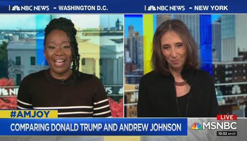 During the final segment of Saturday’s edition of AM Joy, host Joy Reid interviewed Brenda Wineapple, author of the book The Impeachers: The Trial of Andrew Johnson and the Dream of a Just Nation. Reid prefaced the interview by comparing President Trump to the notoriously racist President Johnson, whom she described as “another presidential villain.” The MSNBC host repeatedly doubled down on that…