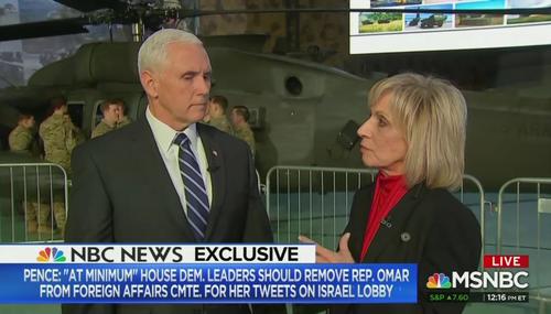 After Vice President Pence called on Rep. Ilhan Omar to be punished for her anti-Semitic remarks, MSNBC host Andrea Mitchell used the blowback against the Democrat to complain about anti-Muslim discrimination. The journalist grilled Pence Wednesday afternoon, while he was in Warsaw, Poland attending a U.S. sponsored summit on the Middle East.
