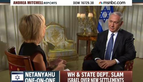 In a contentious interview with Benjamin Netanyahu aired on her 12 p.m. ET hour MSNBC show on Thursday, host Andrea Mitchell badgered the Israeli Prime Minister by repeatedly parroting a nasty attack line from the Obama administration: "...the White House and the State Department say that the new settlements in Arab East Jerusalem undercut your commitment to peace. That it could poison the…