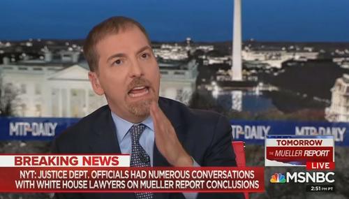 Well, it’s finally here. Special Counsel Robert Mueller delivered his report on the Russia investigation to Attorney General William Barr and the liberal media began to conflagrate. During the early evening buzz on MSNBC’s MTP Daily, host Chuck Todd seemed to express concern over the fact that Mueller allowed President Trump and his legal team to answer written questions, instead of testifying…