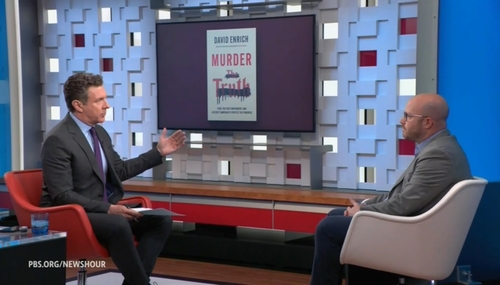 On Monday, PBS News Hour followed NPR's Fresh Air in promoting New York Times reporter David Enrich's anti-Trump book Murder The Truth: Fear, the First Amendment, and a Secret Campaign to Protect the Powerful. Right-wingers from President Trump to Supreme Court Justice Clarence Thomas are cartooned as "truth murderers."