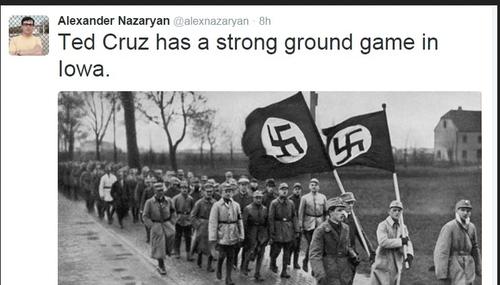In 1992, late-night TV host Arsenio Hall made a bad joke comparing the Pat Buchanan for President campaign to black-and-white Nazi footage. In 2016, the target is Ted Cruz. Alex Nazarayan, a writer for the shell of a publication branded as Newsweek, caused a Twitter frenzy when he compared Cruz to the Nazis, as captured by John Nolte at Breitbart: