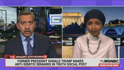On his MSNBC show, Mehdi Hasan teest up notorious antisemite, Democrat Rep. Ilhan Omar, to falsely accuse Donald, Trump of making an antisemitic post, and to wring her hands of the rise of antisemitism in America.