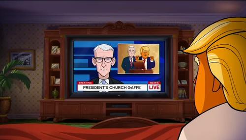 On Easter Sunday, Stephen Colbert’s anti-Trump animated cartoon show on Showtime, Our Cartoon President portrays President Trump as desperate to increase his waning support from evangelical voters. In “Church and State” he is caught on an open mic saying to Vice President Mike Pence that he would "cut off God’s penis” if his wife were to become pregnant as Joseph’s wife, Mary, did.