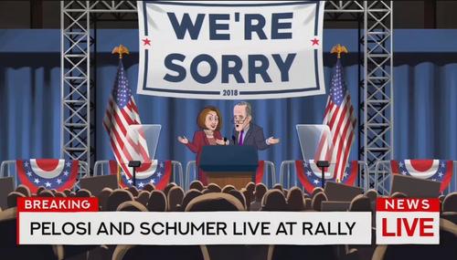 Taking a swipe at the Democrats as the return of Our Cartoon President aired on Showtime, Stephen Colbert’s animated show has House Minority Leader Nancy Pelosi and Senate Minority Leader Chuck Schumer come up with a new slogan for Democrats in the 2018 elections. The slogan “We're Sorry” was hatched to win back voters on the July 15 episode titled “Russia Investigation.”